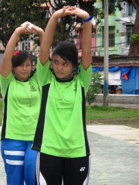 Siswa sebuah sekolah swasta Kota Binjai sedang senam di lapangan merdeka Binjai, Rabu (18/1). Dana Bos diharapkan oleh siswa - siswa Binjai segera datang agar dapat dipergunakan untuk keperluar sekolahnya.
