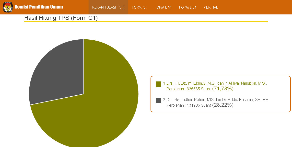 Berdasarkan penelusuran Tribun Medan, Kamis (10/12/2015) petang dari situs resmi KPU, pasangan nomor urut 1, Dzulmi Eldin-Akhyar Nasution memperoleh 335585 suara (71.78 persen).