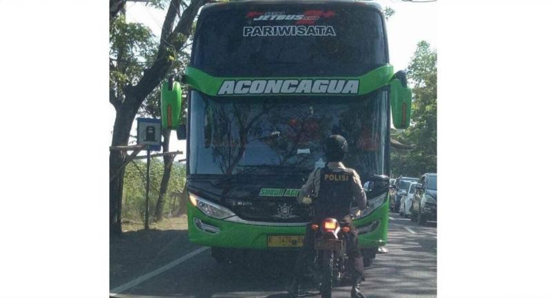 Sebuah bus besar yang mendahului kendaraan lain di depannya justru diadang polisi.