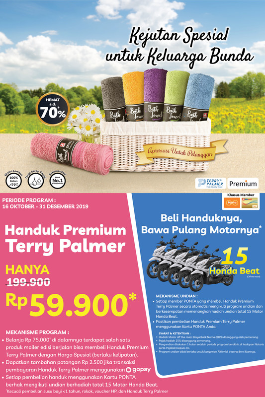 Handuk yang dijual di Alfamidi adalah handuk Premium Terry Palmer yang sudah terbukti kualitasnya. Produk tersebut ditawarkan dengan harga khusus hanya Rp 59.900,-. Untuk mendapatkan handuk Premium Terry Palmer di Alfamidi dengan harga spesial, konsumen cukup berbelanja minimal Rp 75.000,- dengan disertai salah satu produk sponsor di dalamnya dan berlaku kelipatan. Bagi konsumen yang bertransaksi menggunakan Gopay, akan mendapat tambahan potongan sebesar Rp 2.500,-.