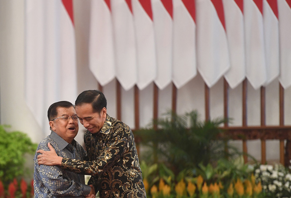 ANTARA FOTO/AKBAR NUGROHO GUMAYPresiden Joko Widodo (kanan) berpelukan dengan Wakil Presiden Jusuf Kalla (kiri) dalam acara silaturahmi kabinet kerja di Istana Merdeka, Jakarta, Jumat (18/10/2019). Silaturahmi itu juga merupakan ajang perpisahan presiden, wakil presiden serta para menteri kabinet kerja yang telah bekerja sama selama lima tahun pemerintahan Joko Widodo-Jusuf Kalla.