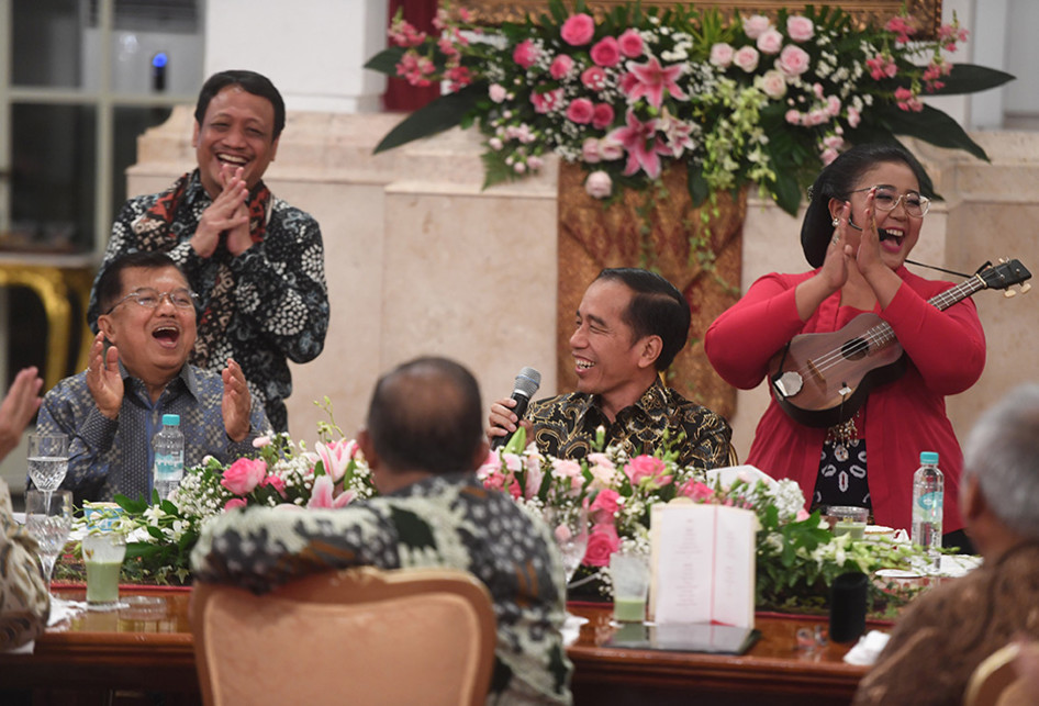"Mohon maaf mungkin dalam lima tahun ini kita baru bertemu agak santai mungkin hanya hari ini. Pas akhir-akhir ini kita baru bertemu dan ada yang nyanyi. Biasanya kalau ketemu isinya kalau enggak ratas (rapat terbatas), paripurna," kata Jokowi.