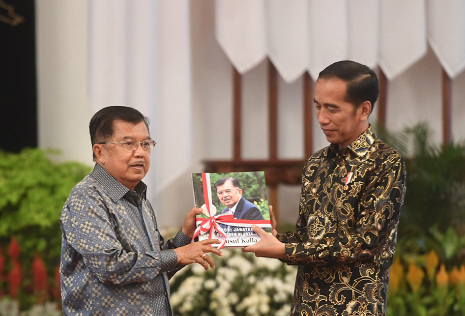 ANTARA FOTO/AKBAR NUGROHO GUMAYPresiden Joko Widodo (kanan) menerima buku memori jabatan dari Wakil Presiden Jusuf Kalla (kiri) dalam acara silaturahmi kabinet kerja di Istana Merdeka, Jakarta, Jumat (18/10/2019). Silaturahmi itu juga merupakan ajang perpisahan presiden, wakil presiden serta para menteri kabinet kerja yang telah bekerja sama selama lima tahun pemerintahan Joko Widodo-Jusuf Kalla.