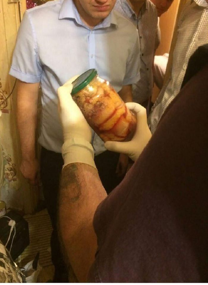 Saat ditangkap, polisi menemukan setidaknya satu botol dengan sisa-sisa manusia yang diawetkan, dan 19 potong kulit ditemukan.