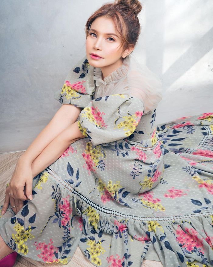 Mantan istri Yoyo Padi ini tampil mengenakan dress bunga-bunga dengan warna biru pastel yang kalem.