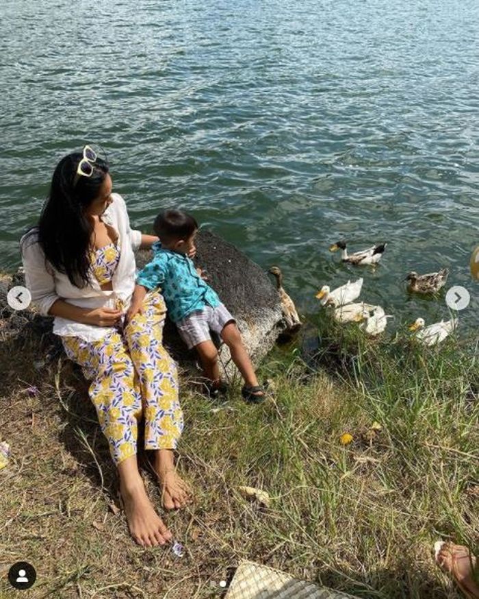 Pada potret berikutnya, Happy Salma tak ketinggalan pamer pose duduk bersama putranya di pinggir danau.