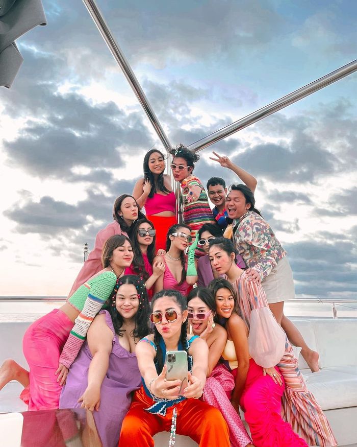 Pada dresscode keempat bertema colorful, Rachel Vennya terlihat berfoto bersama sahabatnya mengenakan busana tanpa lengan berwarna biru dengan celana oranye berbahan silk yang mengkilap.