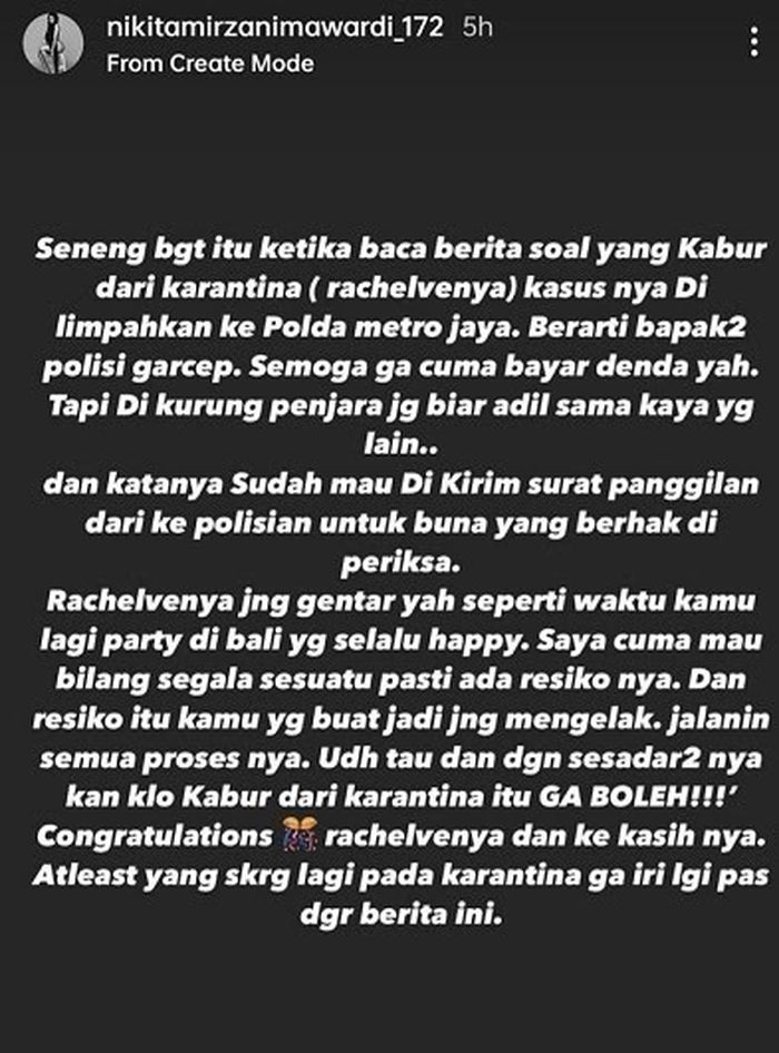 "Senang banget itu ketika baca berita soal yang kabur dari karantina (Rachel Vennya) kasusnya dilimpahkan ke Polda Metro Jaya, berarti bapak-bapak polisi gercep," kata Niki seperti dikutip dari Instagram Story, Minggu (17/10/2021).