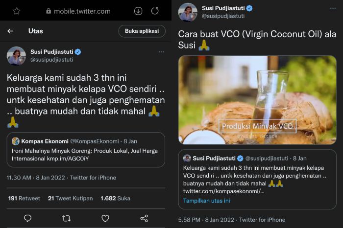 Dalam cuitannya tersebut, Susi Pudjiastuti mengomentari fenomena mahalnya harga minyak goreng di Tanah Air.
