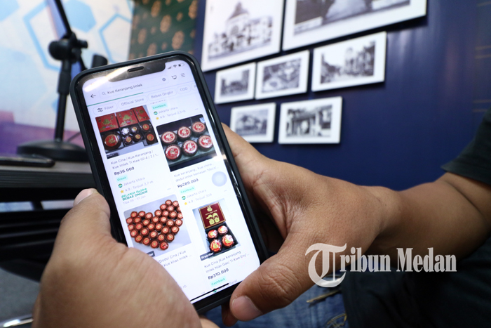 TRIBUN-MEDAN.com, MEDAN - Warga tengah memesan kue keranjang melalui aplikasi dari telepon genggamnya di Medan, Jumat (28/1/2022). Menjelang Tahun Baru Imlek, pemesanan kue keranjang melalui aplikasi Tokopedia naik empat kali lipat dibandingkan dengan periode yang sama pada tahun lalu.