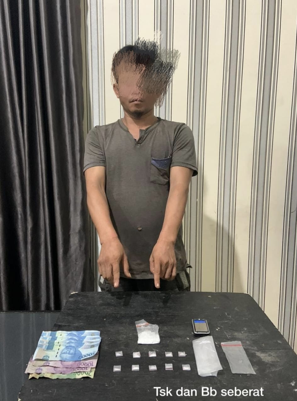Saat menggeledah polisi menemukan barang bukti berupa 11 paket plastik klip berisikan Kristal putih diduga narkotika sejumlah 13,93 gram, 1 buah timbangan elektrik, 1 lembar plastik klip berles merah dalam keadaan kosong yang dibungkus dengan 1 lembar plastik bening sebagai pembungkus dan Uang Tunai Sebesar Rp. 240.000.