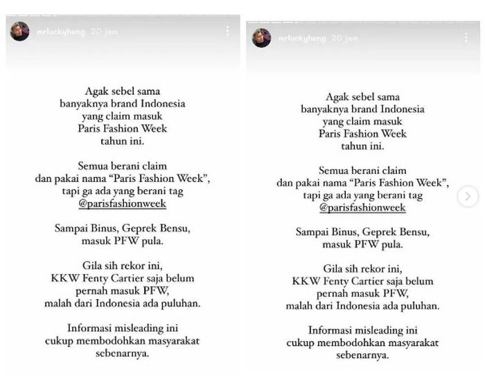 Melalui akun instagramnya, Lucky Heng mengaku geram dengan brand Indonesia yang mengaku tampil di PFW 2022.