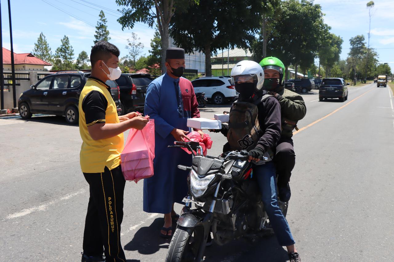 Kapolres Humbahas AKBP Achmad Muhaimin menjelaskan Jumat Berkah kali ini Polres Humbahas ini berbagi nasi kotak kepada masyarakat yang melintas di depan Mako Polres Humbahas dan Jemaah di Masjid Al Muhajirin Lintong Nihuta.