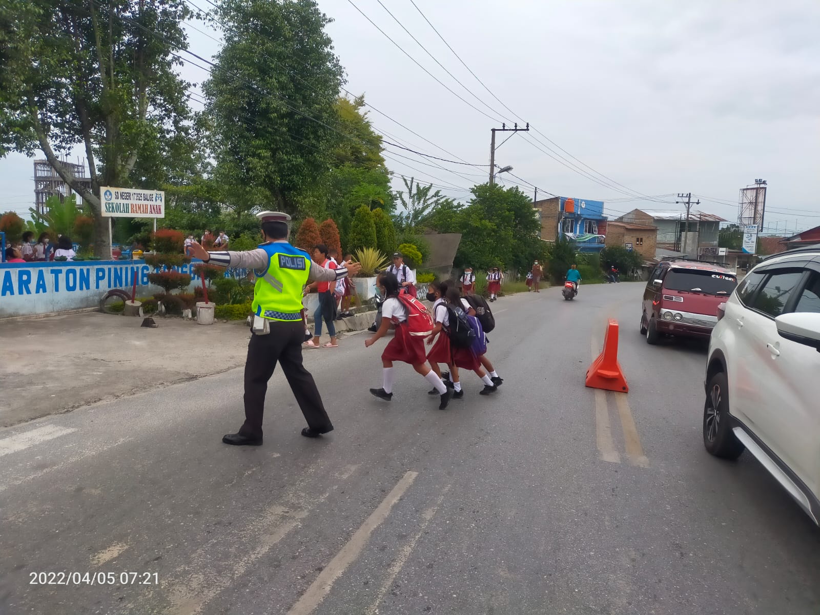 Satlantas Polres Toba tampak menyeberangkan anak sekolah di Jalan Lintas Sumatera, Selasa (5/4/2022).