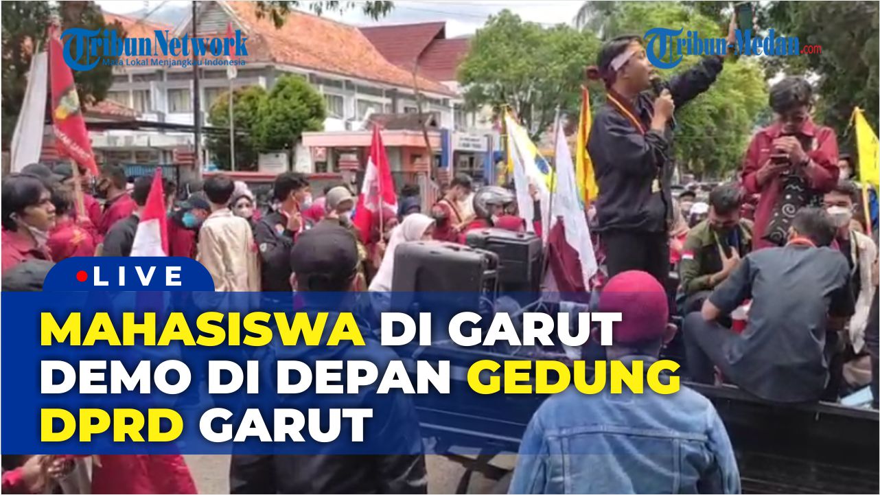TRIBUNMEDAN.COM, GARUT - Sejumlah mahasiswa menggelar aksi unjuk rasa di depan gedung DPRD Garut, Jawa Barat, Jumat (8/4/2022).