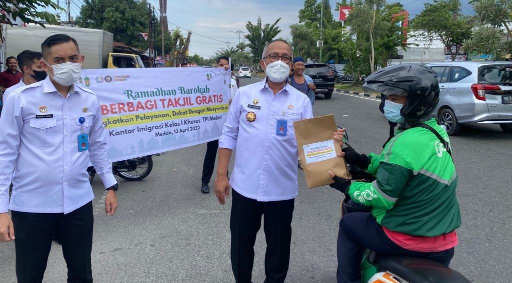 Bertempat di Lapangan Parkir Kantor Imigrasi Kelas I Khusus TPI Medan, Tato Juliadin Hidayawan beserta jajarannya melaksanakan pembagian takjil gratis