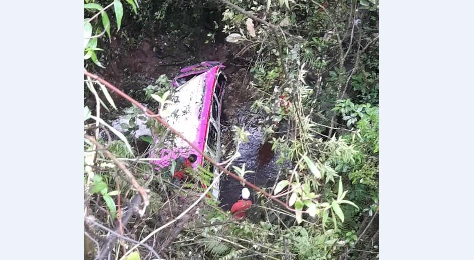 TRIBUN-MEDAN.com, SITINJO - Sebuah mobil bus Raja Naposgos masuk jurang sedalam 10 meter di Jalan Lintas Sidikalang - Medan Lae Pondom Kabupaten Dairi, Kamis (19/4/2022).