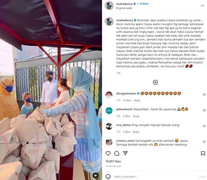 “Hari ini pengen ngajarin Cassia buat berbagi (secara) langsung gitu. Jadi nanti dia yang langsung membagikan (makanan) buat buka puasa,” kata Chacha dikutip dari Instagram @chafrederica baru-baru ini.