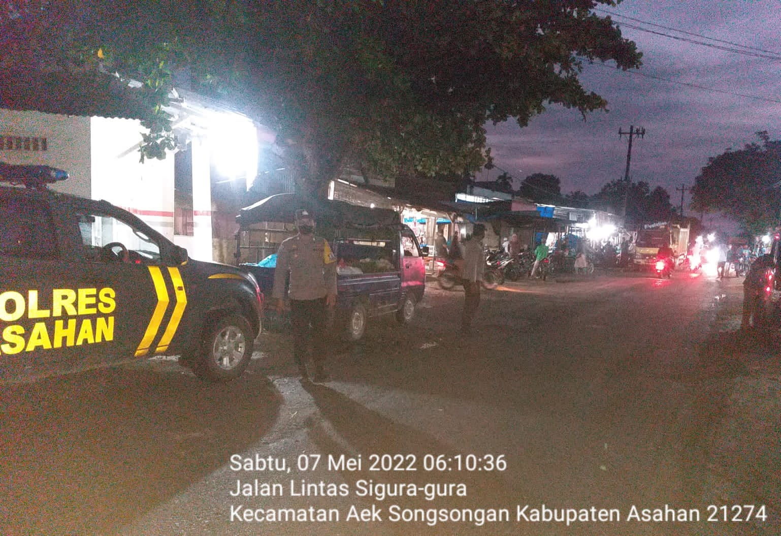 Kegiatan strong point pagi hari oleh personel Aipda Rudi Harianto, Bripka Jhon P Lumbantoruan, Bripka Junifer S dilakukan di Pajak Pagi Jalan Lintas Sigura-gura Desa Aek Songsongan Kec Aek Songsongan.