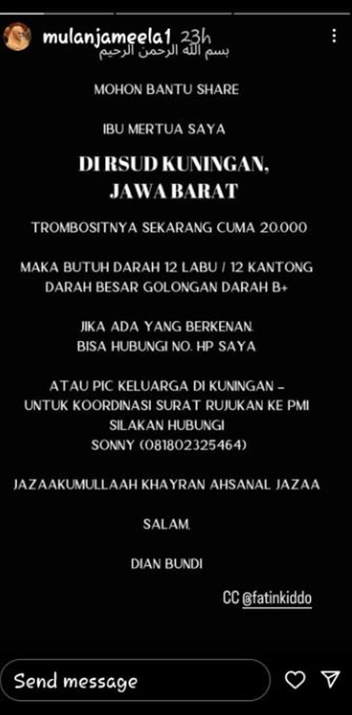 Maka butuh darah 12 labu/12 kantong darah besar golongan darah B+," tulis Mulan Jameela.