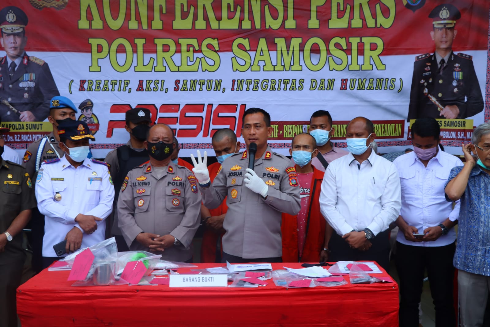 TRIBUN-MEDAN.COM, SAMOSIR -Rilis kasus oleh Kapolres Samosir AKBP Josua Tampubolon SH, MH kali ini berbeda, karena didampingi oleh dari Dinas Perhubungan dan Satuan Pamong Praja Kabupaten Samosir di Mapolres Samosir, Rabu (25/5/2022).