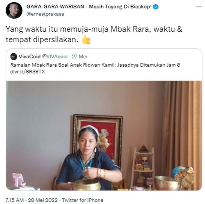 "Yang waktu itu memuja-muja Mbak Rara, waktu & tempat dipersilakan," ujarnya dengan menyertakan emoji jempol tangan, dilansir dari akun Twitter @ernestprakasa pada Sabtu (28/5/2022).