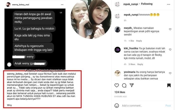 Tangkap layar unggahan Wenny Ariani. 'Saya Tunggu Anda, Hubungi Saya!' Haters Pertanyakan Alasannya Baru Minta Pertanggungjawaban ke Rezky Aditya hingga Senggol dan Hujat Kekey, Wenny Ariani Langsung Naik Pitam Beri Ancaman Ini