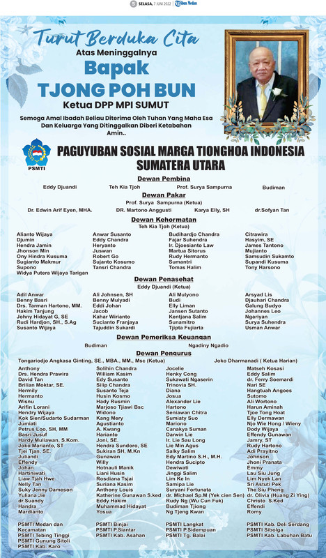 Segenap keluarga besar Paguyuban Sosial Marga Tionghoa Indonesia (PSMTI) Sumatera Utara mengucapkan turut berduka atas meninggalnya Ketua DPP MPI Sumut Tjong Poh Bun.