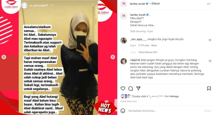 "Sekali lagi, terima kasih untuk segalanya. Bagi yang Abel utangi maaf Abel belum bisa bayar. Kalian bisa tagih Abel di akhirat nanti. Maaf udah ngrepotin juga," tulis akun @ja_pamungkas11
