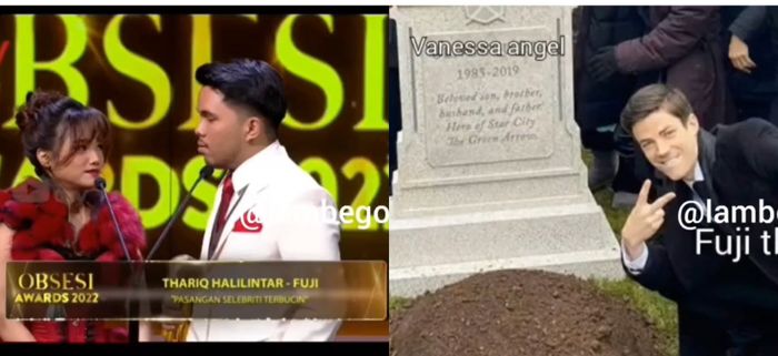 Di gambar kedua terlihat makam yang diibratkan Vanessa Angel, tedapat Fuji dan Thariq disebelahnya.