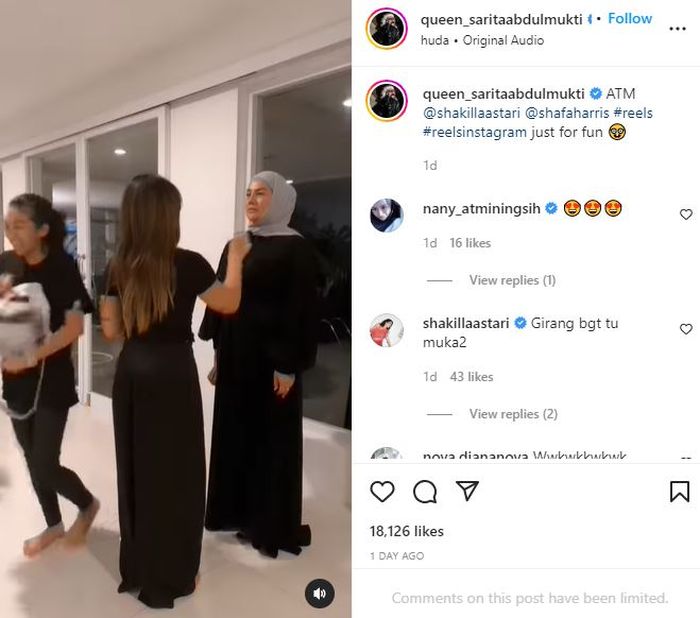"ATM @shakillaastari @shafaharris #reels #reelsinstagram just for fun," tulis Sarita Abdul Mukti.