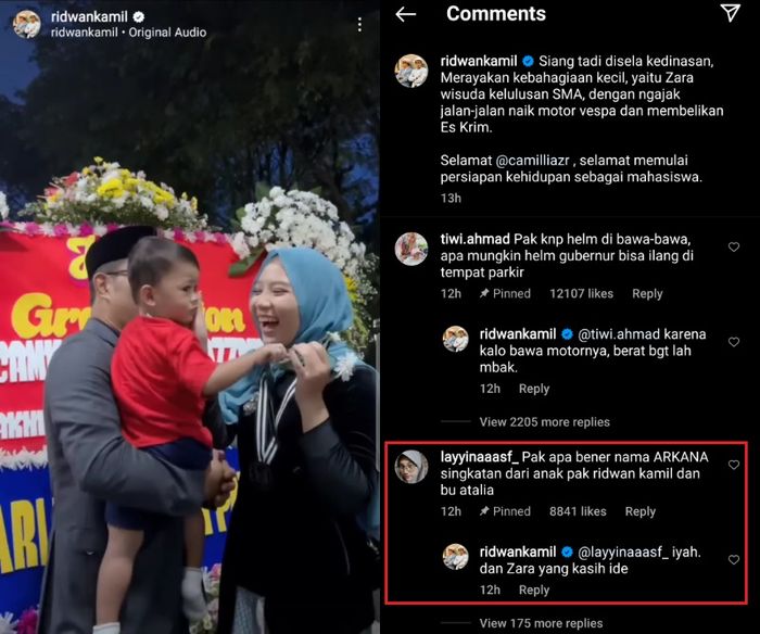 "Pak apa benar nama Arkana singkatan dari anak Pak Ridwan Kamil dan Bu Atalia?" tanya akun @layyinaaasf_.
