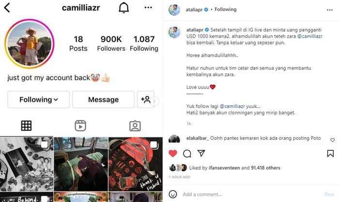 "Setelah tampil di IG live dan minta uang pengganti USD 1000 kemana-mana, alhamdulillah akun Teteh Zara @camilliazr bisa kembali," tulis Atalia Praratya.