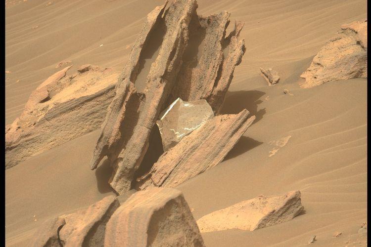 Melalui akun Twitter-nya, Perseverance mengunggah foto selimut termal buatan manusia yang terperangkap di antara bebatuan di Planet Merah.