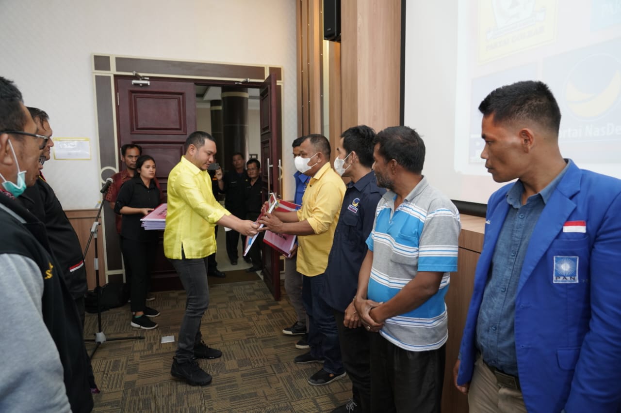Franc Bernhard Tumanggor menyerahkan bantuan keuangan kepada Partai Politik dan Organisasi Masyarakat di Kabupaten Pakpak Bharat.