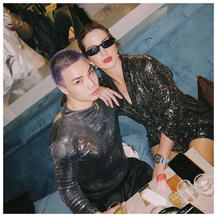Ia juga tampak memadukannya dengan pemakaian makeup bold dengan perona bibir warna merah merekah.
