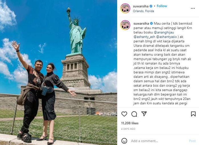 "Hal ini terjadi lagi pas aku di Baltimor karena suatu kendala lagi aku pergi ke Orlando sendirian dan bosku sangat-sangat khawatir setiap beberapa menit chat dan telepon menanyakan apa aku baik-baik saja itu trs yg di tanya sampai aku di Orlando ketemu tim yang lain biar bisa tenang, dengan apa aku membalas kebaikan beliau-beliau ini selain doa dan cinta dariku makanya aku sangat menyayanginya love you @thehermansyaha6," pungkasnya.