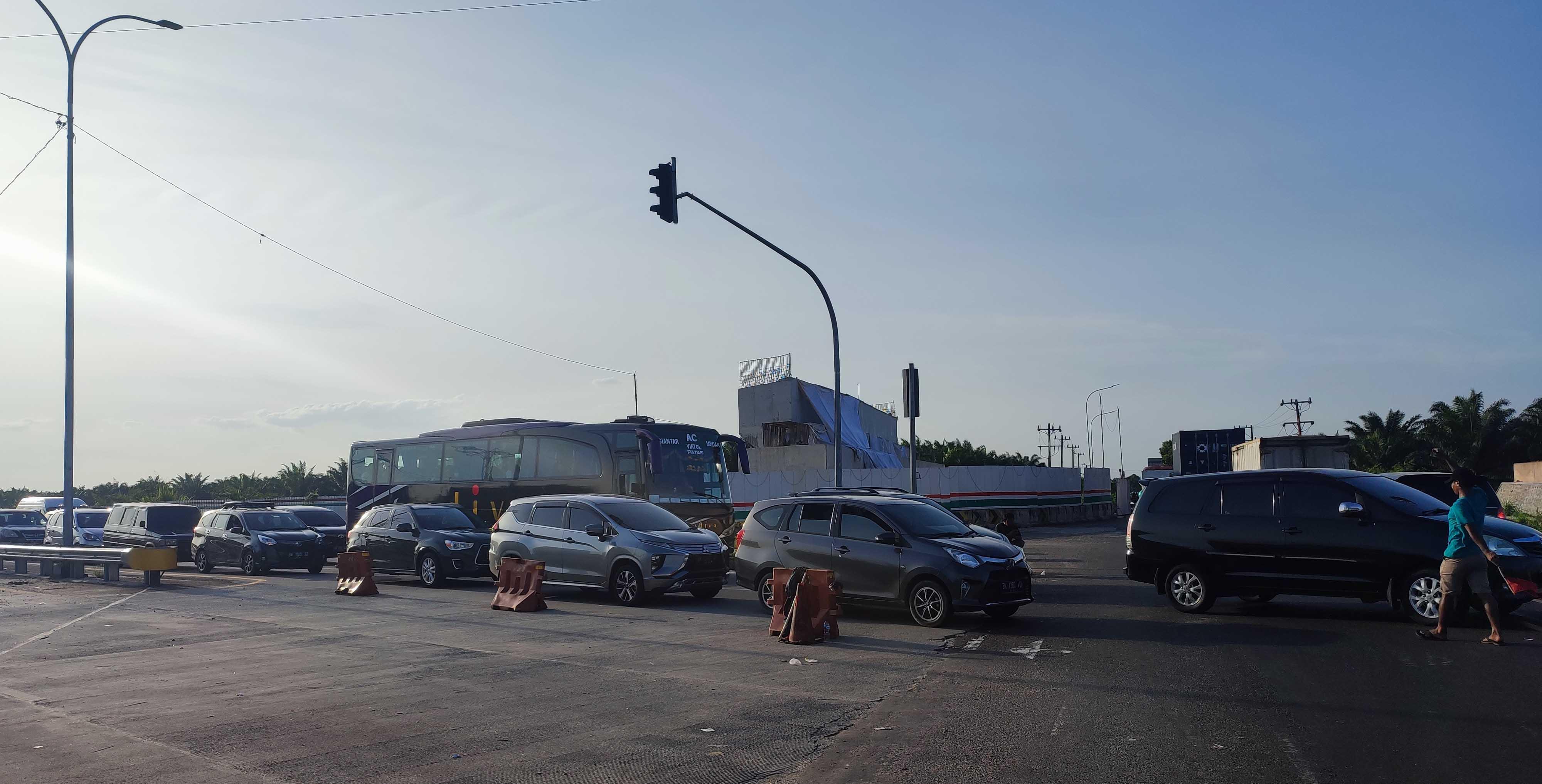 Kendaraan di dominasi mobil pribadi dan truk pengangkut barang. Meski dipadati kendaraan tidak tampak ada petugas kepolisian yang berjaga untuk mengurai kendaraan yang datang dari tol menuju jalan lintas Sumatera.