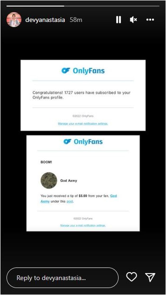 Pasalnya, dalam postingannya itu, Devy Anastasia tampak memamerkan akun OnlyFans miliknya yang baru saja mendapat ribuan subscribers.
