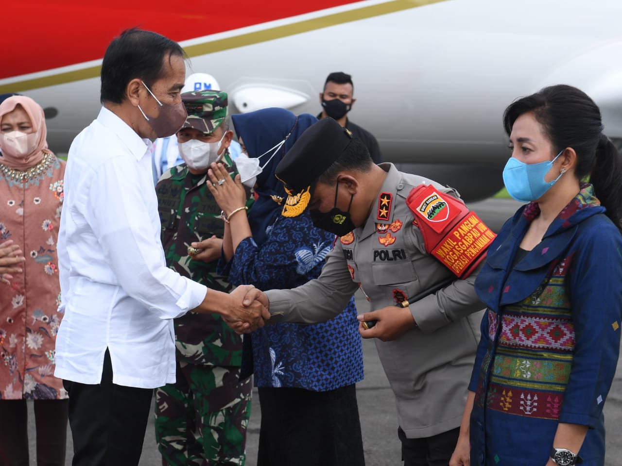 Kapolda Sumatera Utara Irjen Pol RZ Panca Putra Simanjuntak beserta istri, Wali Kota Medan, dan Danlanud Soewondo beserta istri menyambut kedatangan presiden Jokowi di Pangkalan Udara Soewondo, Kota Medan, pada Selasa, 5 Juli 2022, sekitar pukul 16.05 WIB.