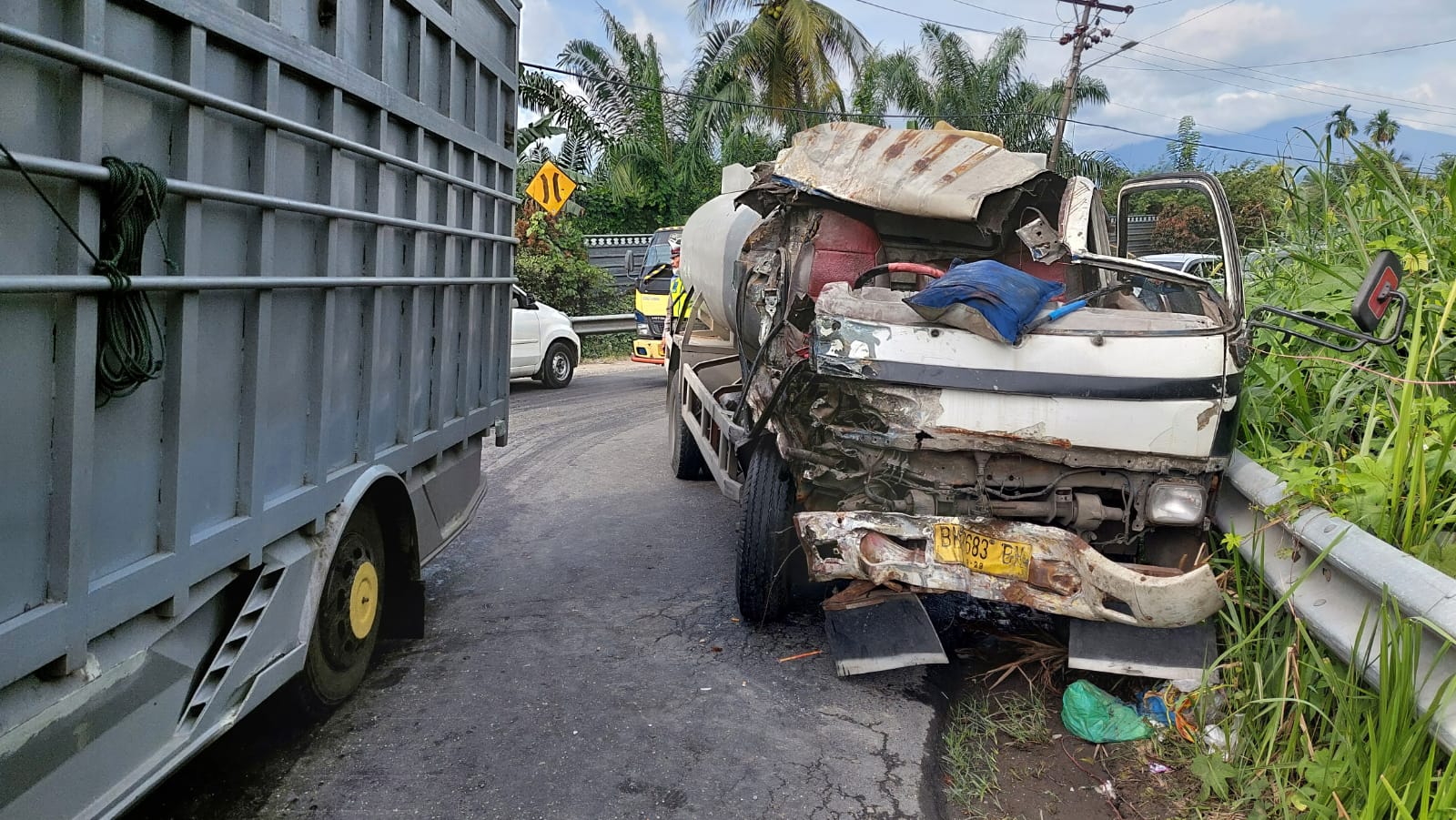 Tabrakan antara truk pengangkut air dan truk pengangkut pasir terjadi di Jalan Jamin Ginting, Desa Sugau, Kecamatan Pancu Batu