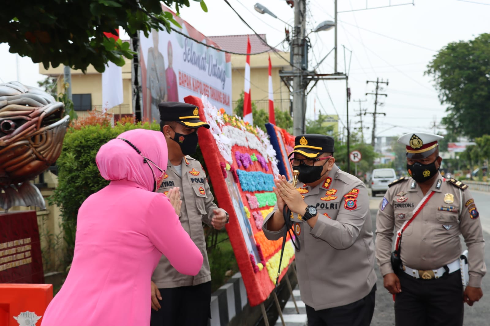 Penyambutan itu dilanjutkan dengan pengalungan bunga dan penyerahan buket oleh Polisi Cilik TK Bhayangkari Tanjungbalai. Giat yang dilaksanakan pada Hari Kamis Tanggal 14 Juli 2022, sekitar Pukul 09.10 Wib di Halaman Apel Polres Tanjungbalai.