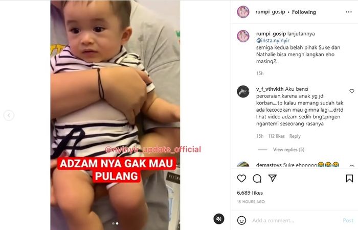 Postingan akun IG @rumpi_gosip yang perlihatkan wajah Adzam yang sedih saat berpisah dari Ferdi.