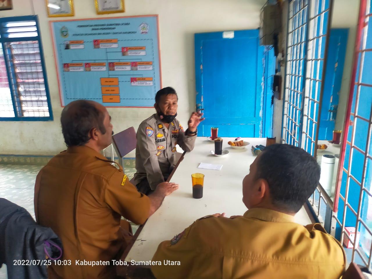 Personel Binmas Polres Toba saat melakukan sosialisasi kembali kepada guru terkait prokes sesuai anjuran pemerintah, Senin (25/7/2022)