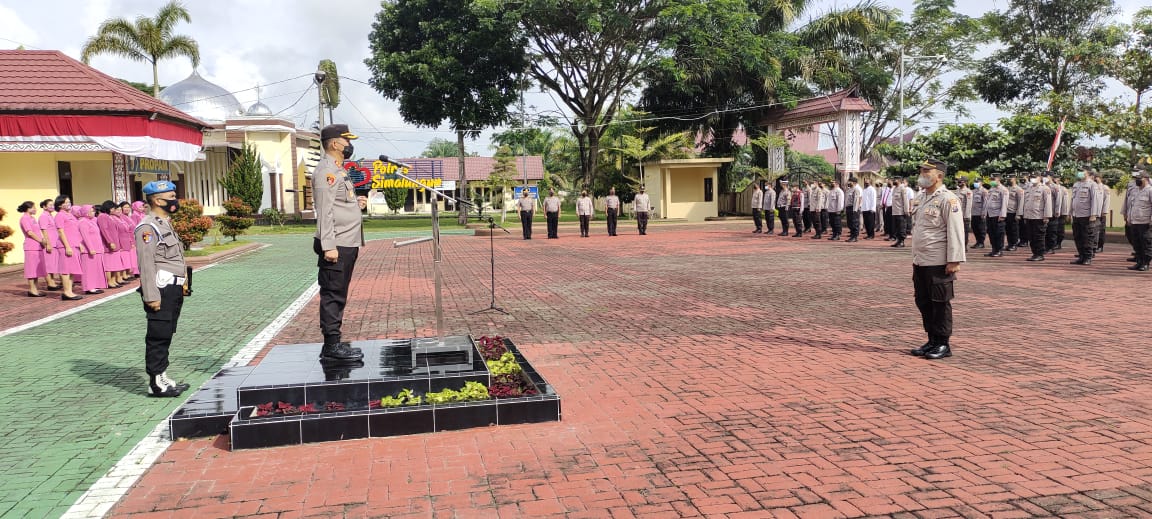 Kapolres Simalungun AKBP Ronald FC Sipayung, SH SIK MH memimpin pelaksanaan Korp Raport kenaikan pangkat pengabdian dan pemberian bingkisan cendera