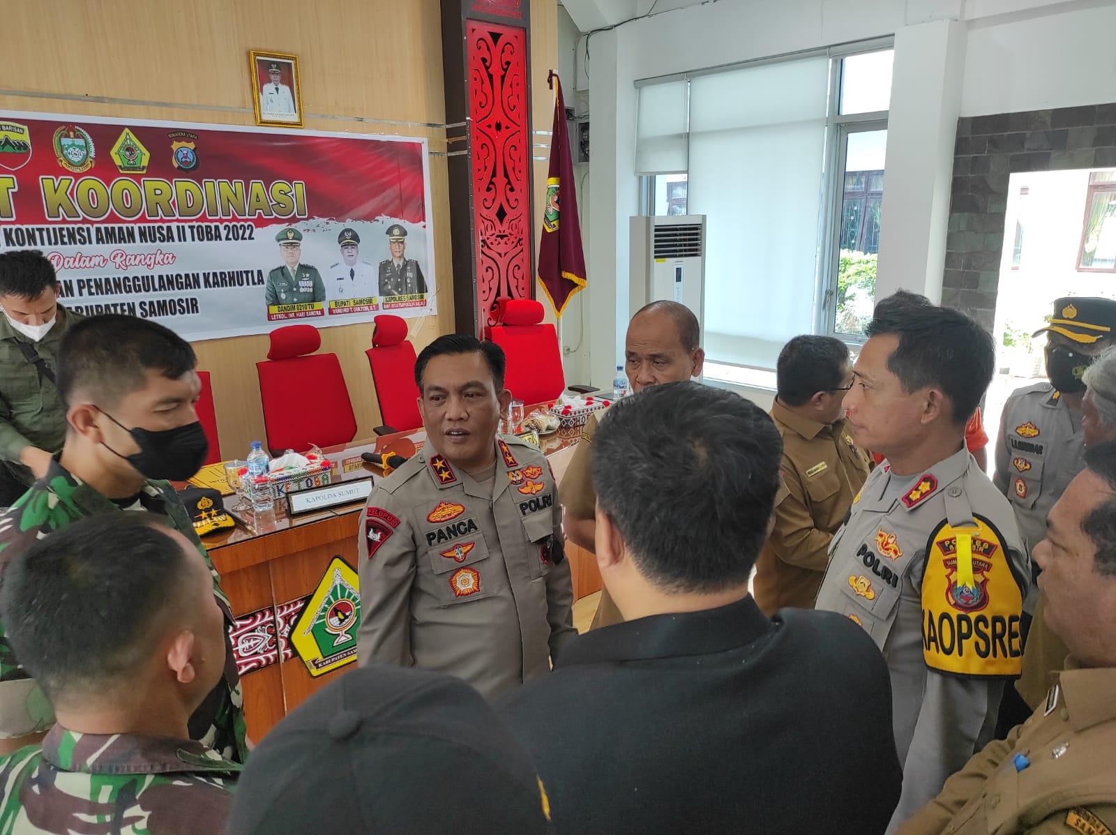 TRIBUN-MEDAN.com, SAMOSIR - Kapolda Sumut Irjen Pol Panca Putra Simanjuntak memimpin Rapat Koordinasi (Rakor) Operasi Kontijensi Aman Nusa II Toba 2022 bertempat di Kantor Bupati Samosir.