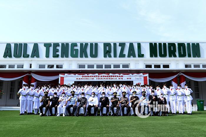 TRIBUN-MEDAN.com, MEDAN - Gubernur Sumut Edy Rahmayadi beserta Forkompinda Sumut foto bersama dengan Pasukan Pengibar Bendera Pusaka (Paskibraka) Sumut setelah dikukuhkan di Aula T Rizal Nurdin, Medan, Senin (15/8/2022).