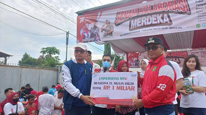 TRIBUN-MEDAN.COM, MEDAN - Rektor Universitas Mahkota Tricom Unggul (MTU) Dr. Dompak Pasaribu SE, M. Si, CPA, secara simbolis menyerahkan beasiswa senilai Rp 1 miliar kepada Lurah Tanjung Mulia Hilir Kecamatan Medan Deli Kota Medan Hendra Syahputra, ST., MAP., pada acara Senam Kolaborasi Merdeka yang diselenggrakan Kelurahan Mabar dan Kelurahan Tanjung Mulia Hilir Jalan Kayu Putih Medan, Minggu (21/8).