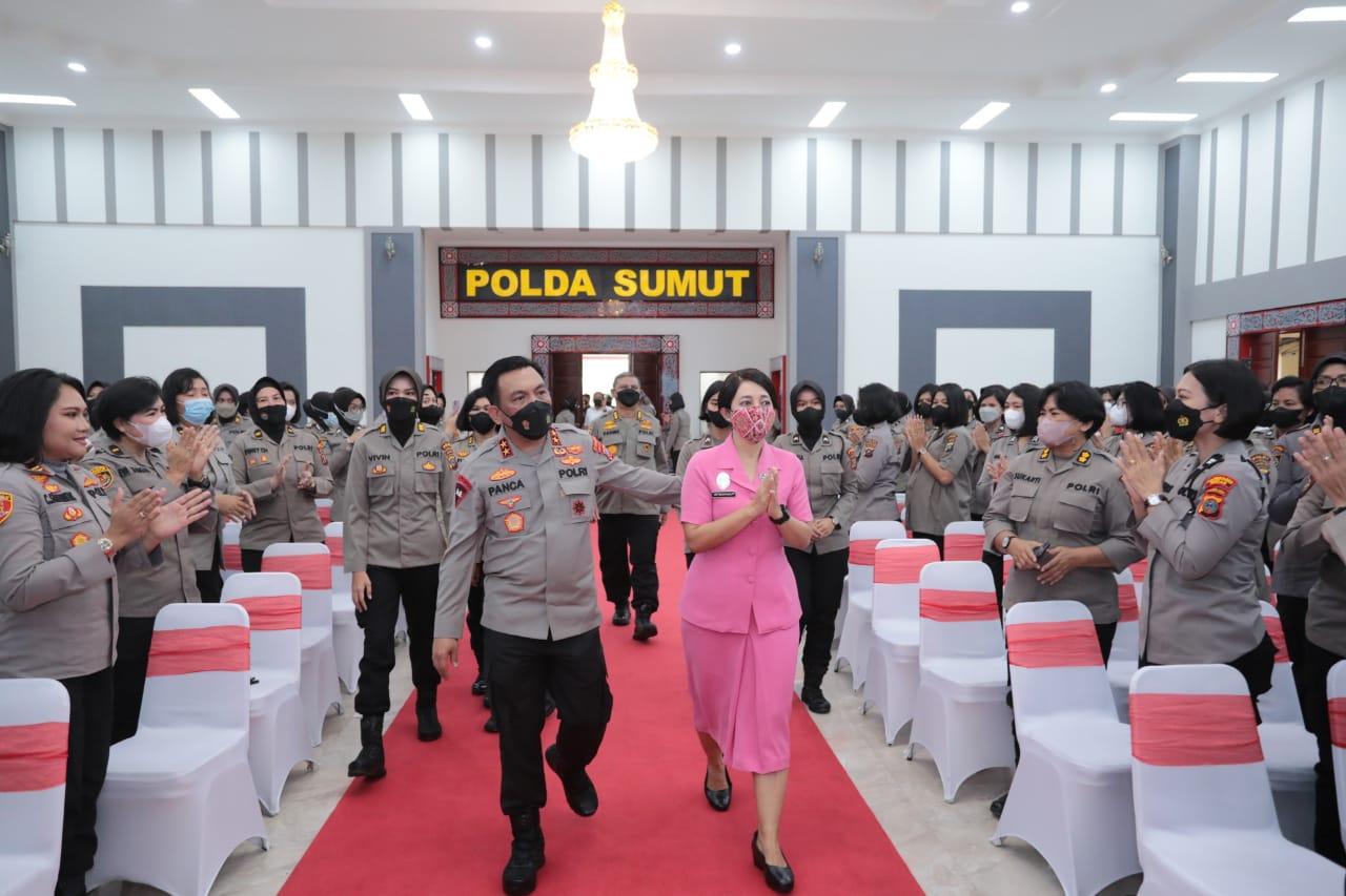 Kapolda Sumut Irjen Pol Panca Putra Simanjuntak bersama Ketua Bhayangkari Daerah Sumut sekaligus Ibu Asuh Polwan Polda Sumut Ny. Rita Panca hadir untuk memberikan arahan.
