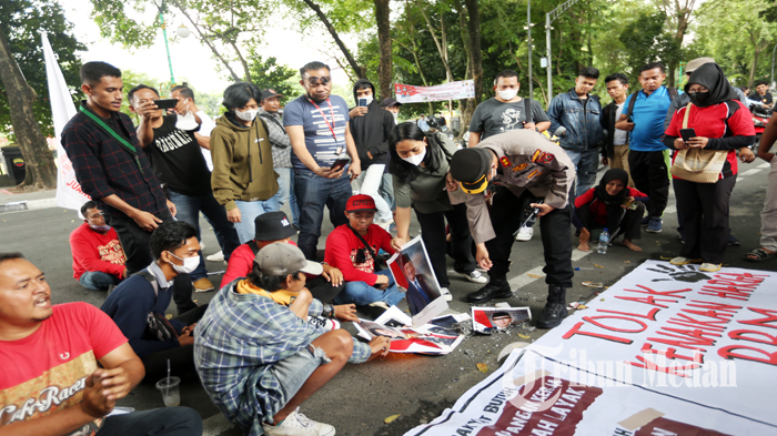 Poster bergambar Puan Maharani dibakar para pendemo yang melakukan aksi di depan gedung DPRD Sumut.